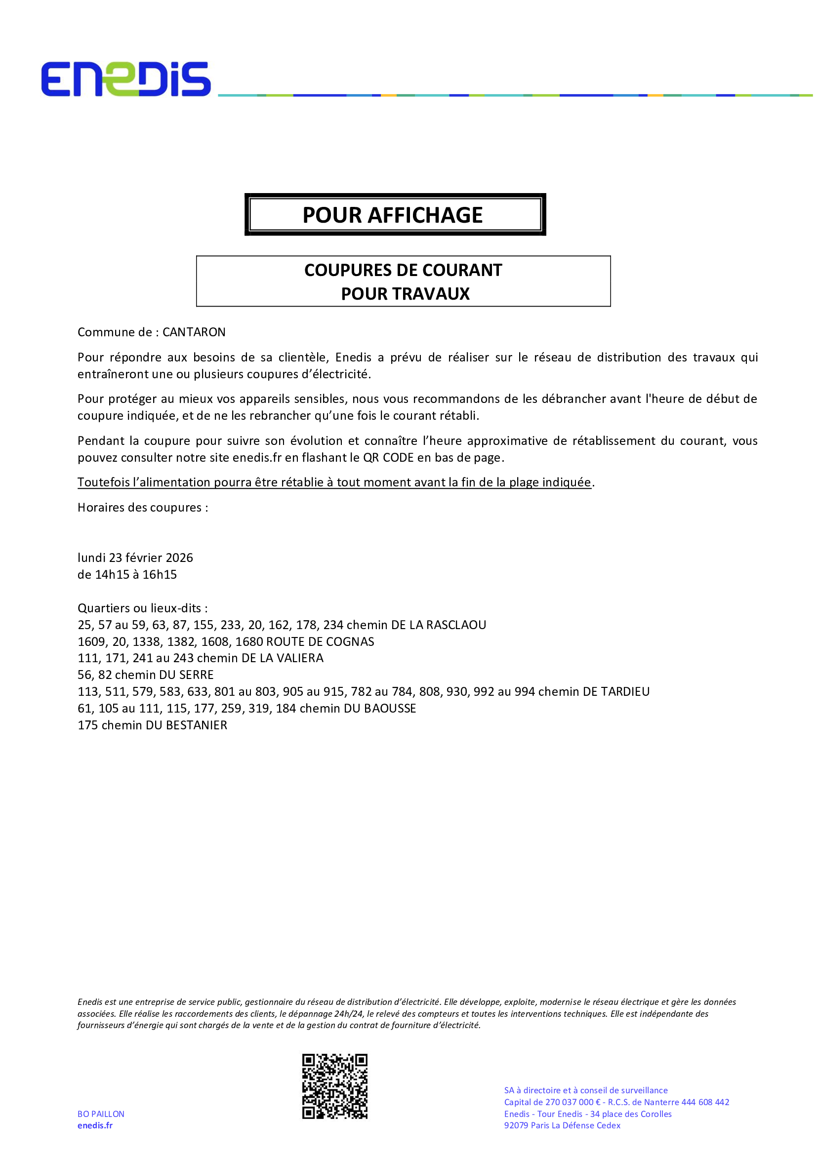 Coupures de courant pour travaux ENEDIS LUNDI 23 FEVRIER 2026